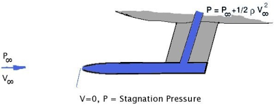 The airspeed of an aircraft can be obtained from the difference between atmosphere static pressure and the measured total pressure from a pitot tube placed in the airflow. The two pressures required come from lines to the Static Port and an second to the Pitot Port. The difference between these pressures is the dynamic pressure created by the motion of the vehicle through the air.